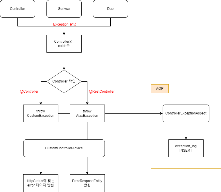 마지막으로 AOP를 사용해 컨트롤러에서 Exception이 throw되면 exception_log 테이블에 INSERT되도록 한다.