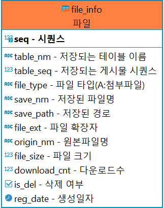 file_info는 프로젝트의 모든 파일 정보를 저장하는 테이블이어서 어떤 테이블의 어떤 게시물의 첨부파일인지 table_nm, table_seq 컬럼에 저장한다.