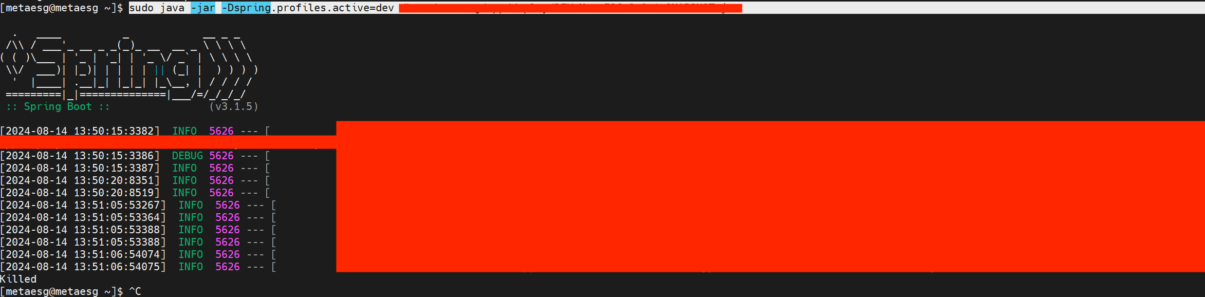 부랴부랴 서버 접속해서 어플리케이션을 실행시켜봤는데 아래처럼 Killed라는 유언을 남기고 죽어버리는 것을 발견했다