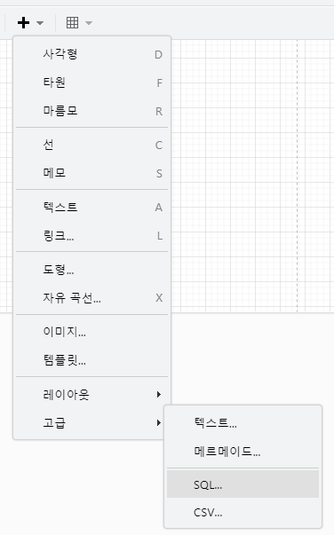 삽입 > 고급 > SQL 기능은 아래와 같이 CREATE문으로 ER다이어그램을 그려주는 기능이다.