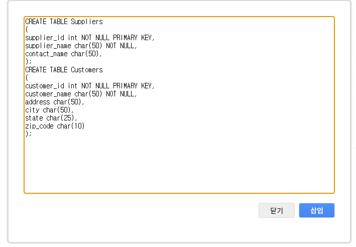이걸 디비버에서 실행시킨 후 조회된 row들을 복사하여 [삽입 > 고급 > sql] 클릭 후 입력하면
