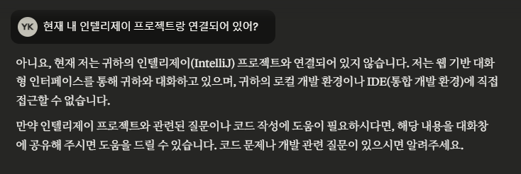 이후 클로드에게 인텔리제이 프로젝트에 연결되어있는지 물어본다.