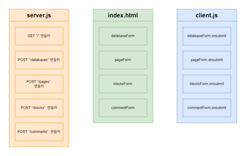 데이터베이스 생성, 페이지 생성, 블록 생성, 댓글 생성을 위한 4개의 form과 response를 보여줄 element들이 있다.