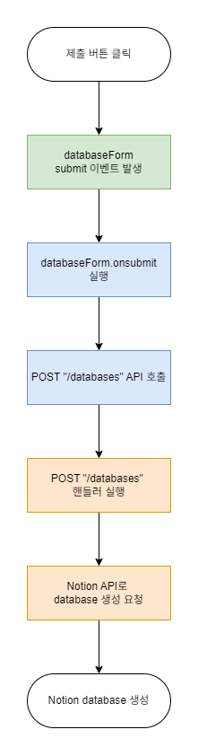 그리고 웹브라우저에서 제출 버튼을 누르면 아래와 같은 흐름으로 노션 데이터베이스가 생성되게 된다.