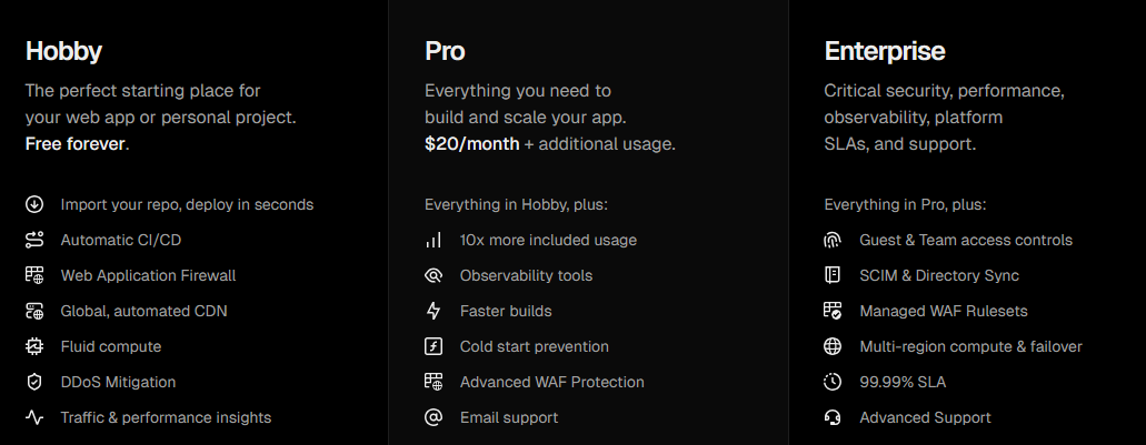 AWS 외의 다른 배포플랫폼 중 프론트엔드 배포에 최적화된 Vercel이 눈에 띄었고, 합리적인 무료 플랜, Next.JS에 특화 등의 이유로 Vercel을 선택하게 되었다.