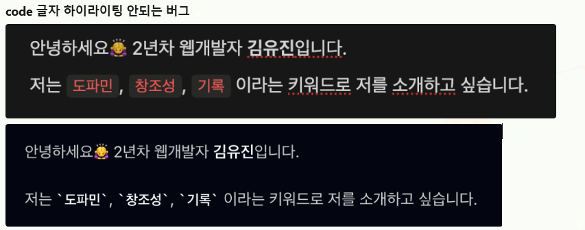 노션에서 하이라이팅한 단어들은 HTML로 변환되는 과정에서 <code> 태그로 감싸지게 되는데,