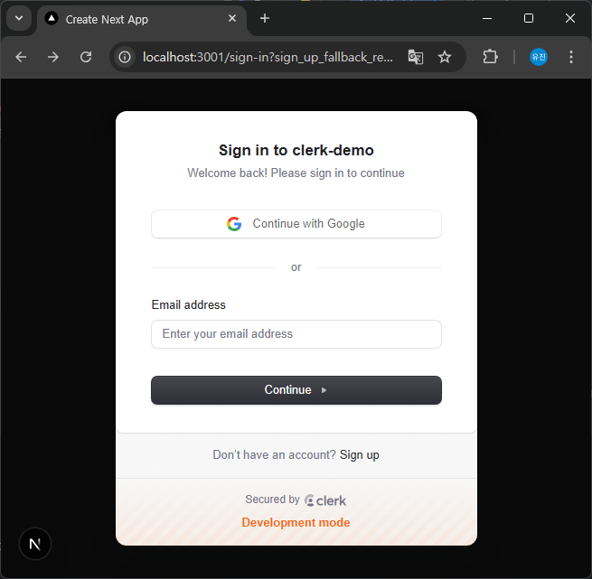 /app/(auth)/sign-in/[[...sign-in]]/page.tsx 파일을 생성하고 아래와 같이 로그인 화면을 생성한다.