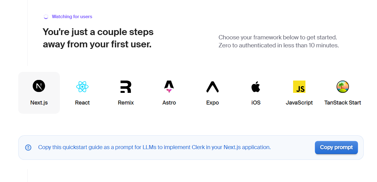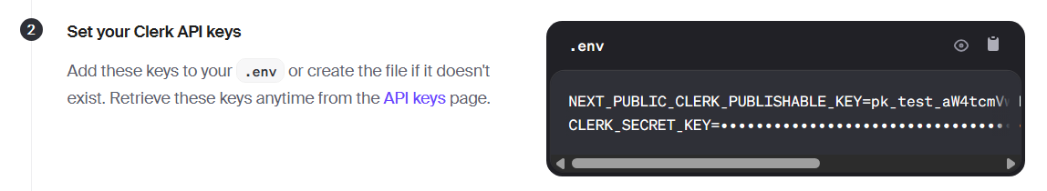 애플리케이션 생성이 완료되면 Clerk 적용 과정을 설명하는 화면으로 이동하게 되는데 이 설명을 따라하면 된다.