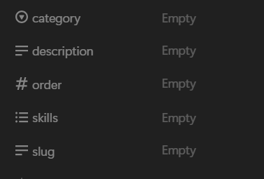 category는 select 타입, description과 slug는 text 타입, order는 number타입, skills는 multi-select 타입이다.