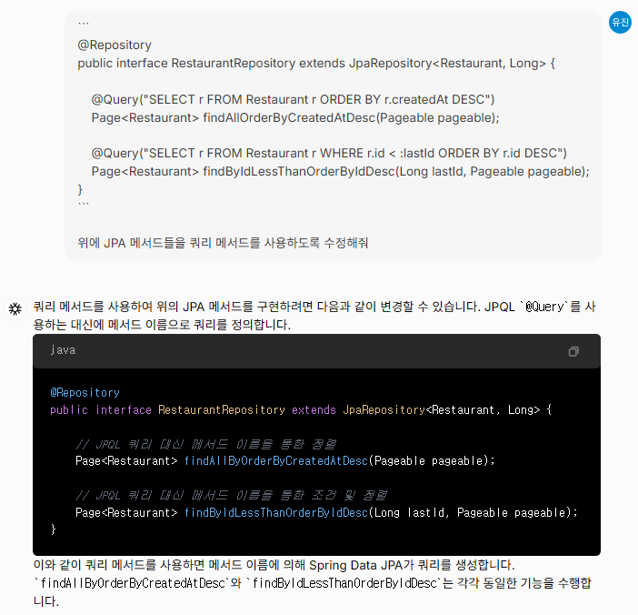 쿼리메서드를 이용하는게 아니라 JPQL로 작성해놨다.