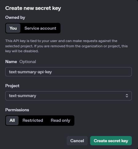 OpenAI platform에 접속한 후 프로젝트를 생성하고 api 키를 발급받는다.